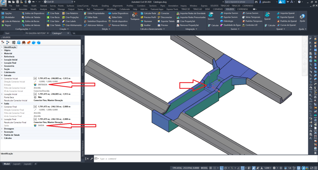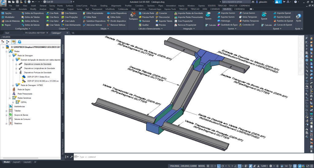 Observe o meio fio (DR06) se conectando a entrada descida d'água (DR11), que por sua vez, conecta-se com a descida de aterro tipo rápido (DAR80) e esta se conecta com saída de descida em aterro com conexão em valeta de proteção (SDV2 80, sim, tem algumas licenças poéticas aí) e esta saída, conecta com a valeta de proteção (DR-3B)