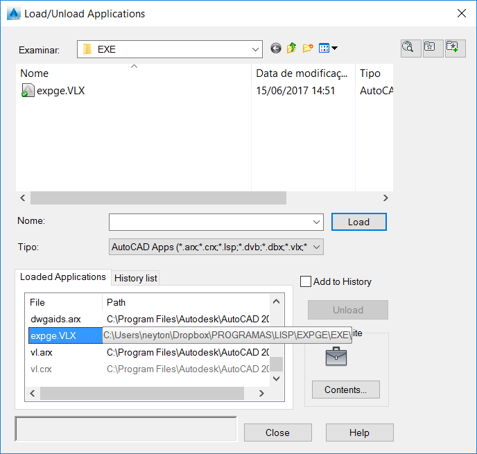 Agora, abra o AutoCAD e faz o APPLOAD e selecione o EXPGE.VLX