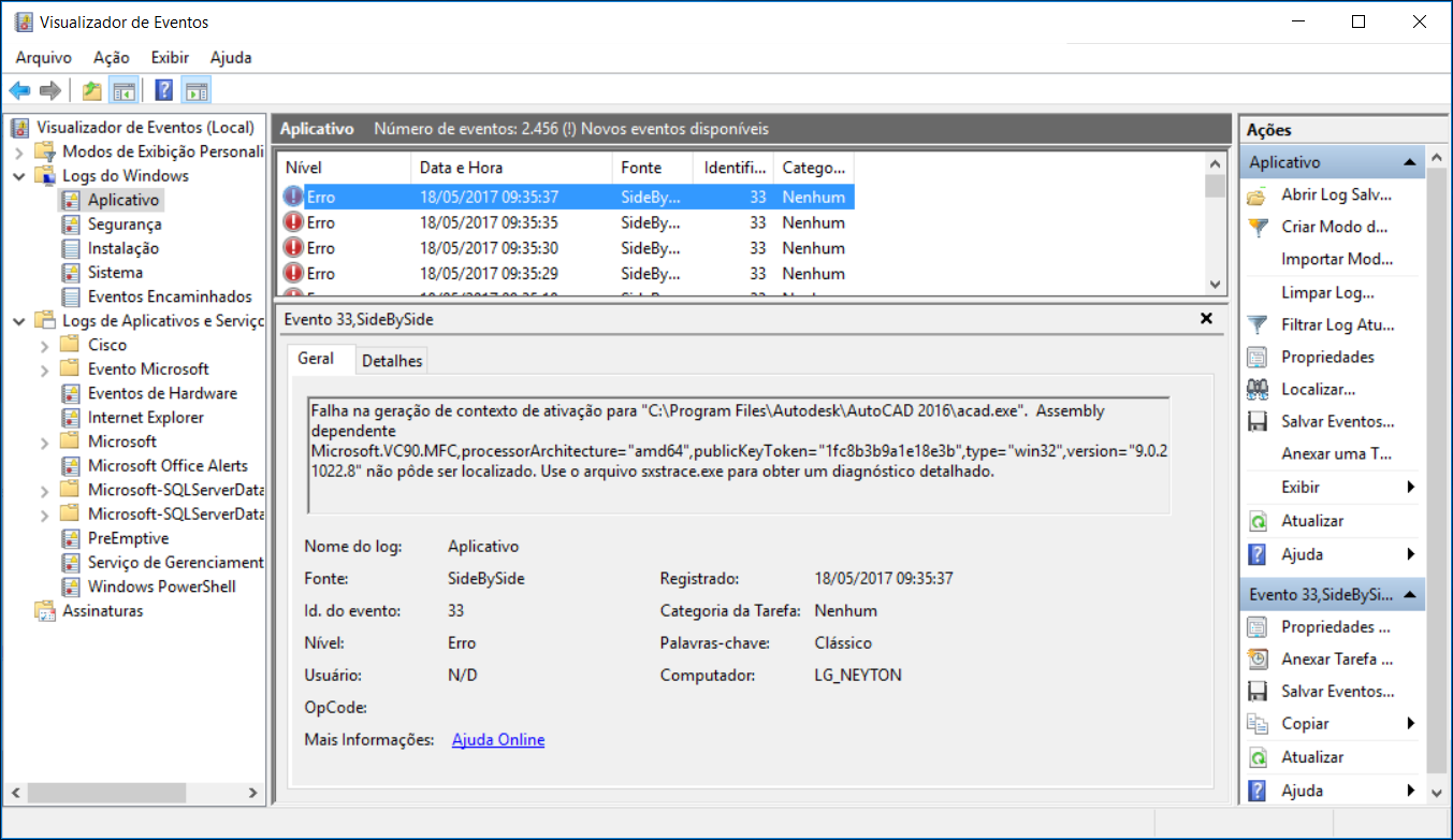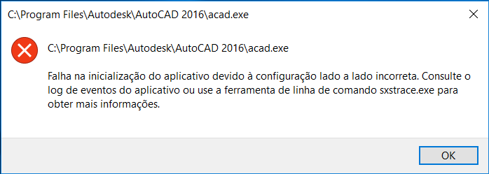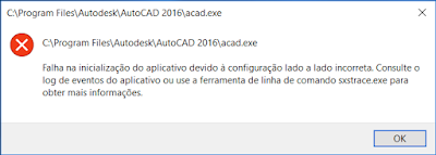Falha na geração de contexto de ativação para “C:Program FilesAutodeskAutoCAD 2016acad.exe”. Assembly dependente Microsoft.VC90.MFC,processorArchitecture=”amd64″, publicKeyToken=”1fc8b3b9a1e18e3b”, type=”win32″, version=”9.0.21022.8″ não pôde ser localizado.