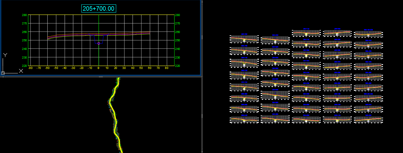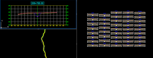Note: um título com a estaca, linhas de grade, eixo, texto com as cotas e a polilinha da seção. Em planta, temos o eixo.
