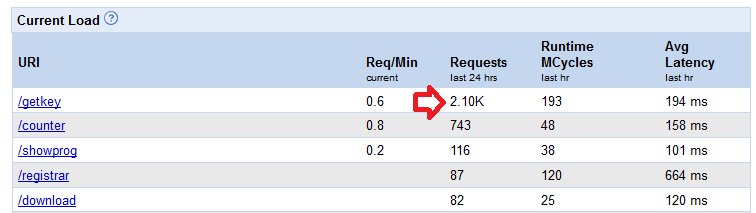 Esta é uma tela do APPENGINE do google, que é o “motor” da página. Ela mostra o número de chamadas nas últimas 24h. Então vejo que tem 2.1K, ou aproximadamente 2100 chamadas.