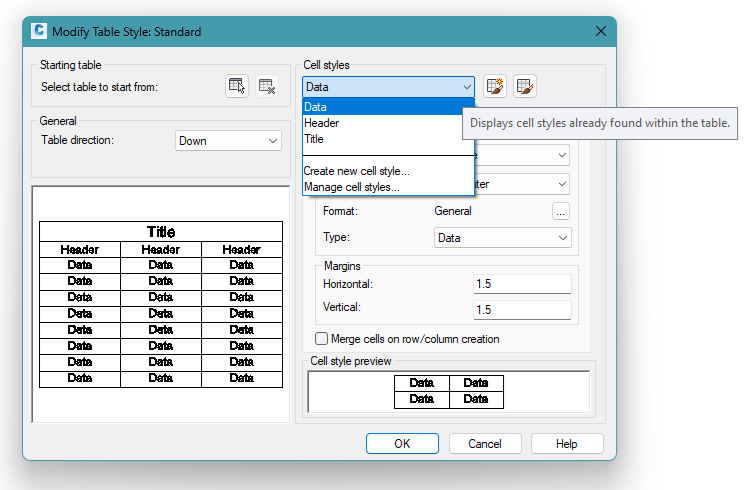 New!!!: A table in AutoCAD can have a title, header, and data. These can have different styles, as shown in the TABLESTYLE command, native to AutoCAD: