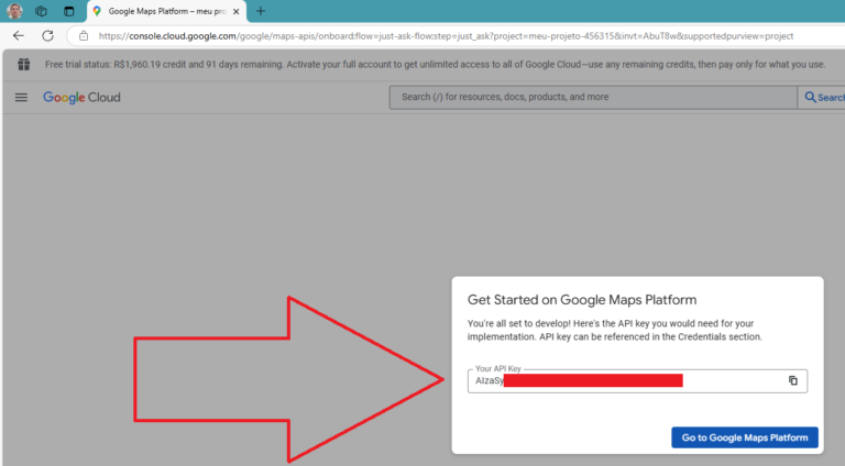 A chave de API é aquela série de caracteres que estão na tela acima. Agora clique em Go to Google Maps Plataform