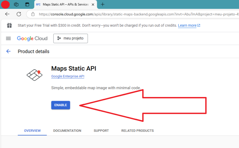 Clique a caixa do Maps Static API, e a tela a seguir irá abrir. Clique Enable: