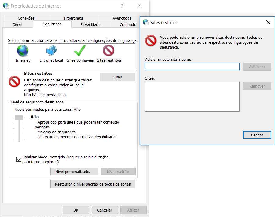 Para corrigir esse erro, vá no menu iniciar e digite Opções de Internet. Clique-o (você pode encontrar este mesmo item no Painel de Controle) e na tela que abre, remova o site https://tbn2net.com/ da lista de sites restritos: